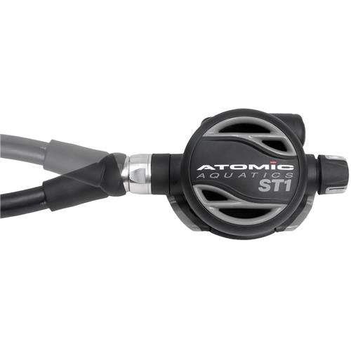 Equipped with Atomic's patented automatic flow control (AFC), the ST1 second stage optimizes breathing resistance at all depths. A soft, over-molded rapid adjustment knob is available for special situations. Atomic's comfort swivel eliminates the "pulling effect" when turning underwater, allowing 30 Degree of rotational movement without kinks. The regulator includes a 3/8" threaded, 32" low-pressure hose and weighs 2.3 lbs. An owner's manual is also provided.