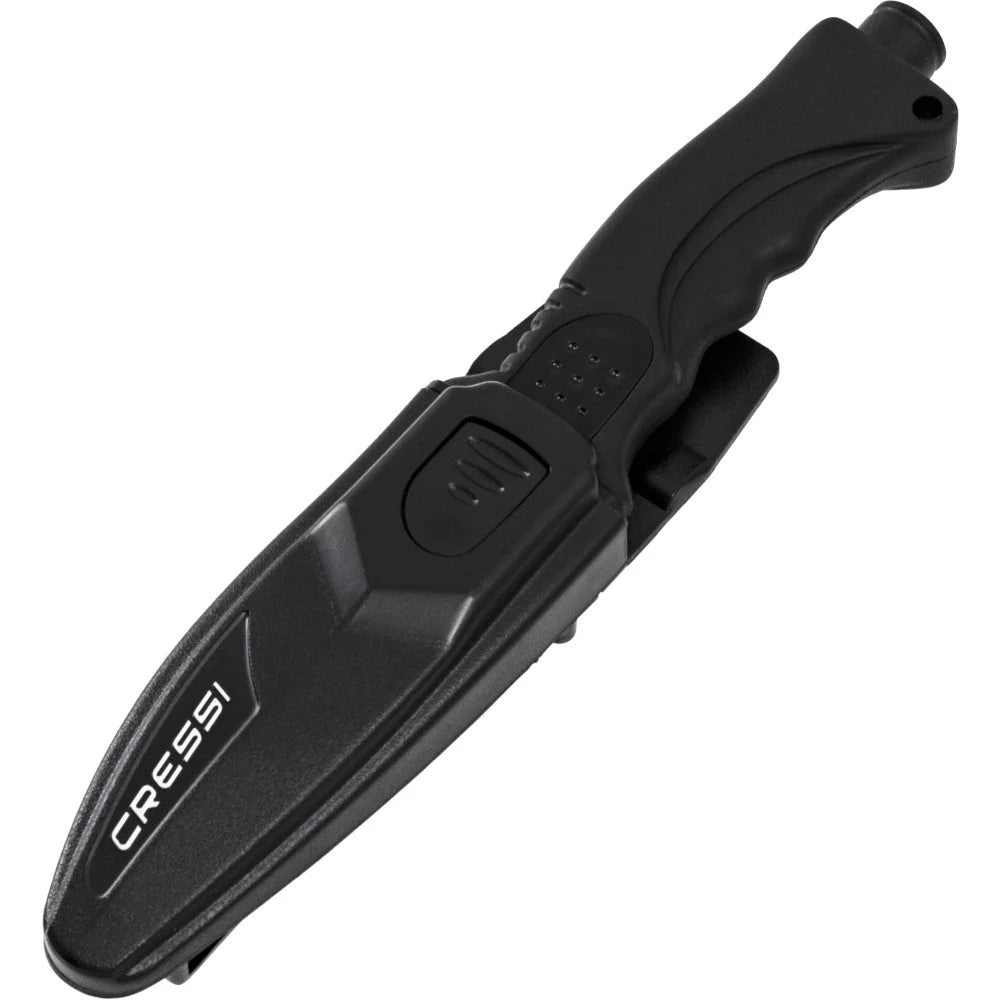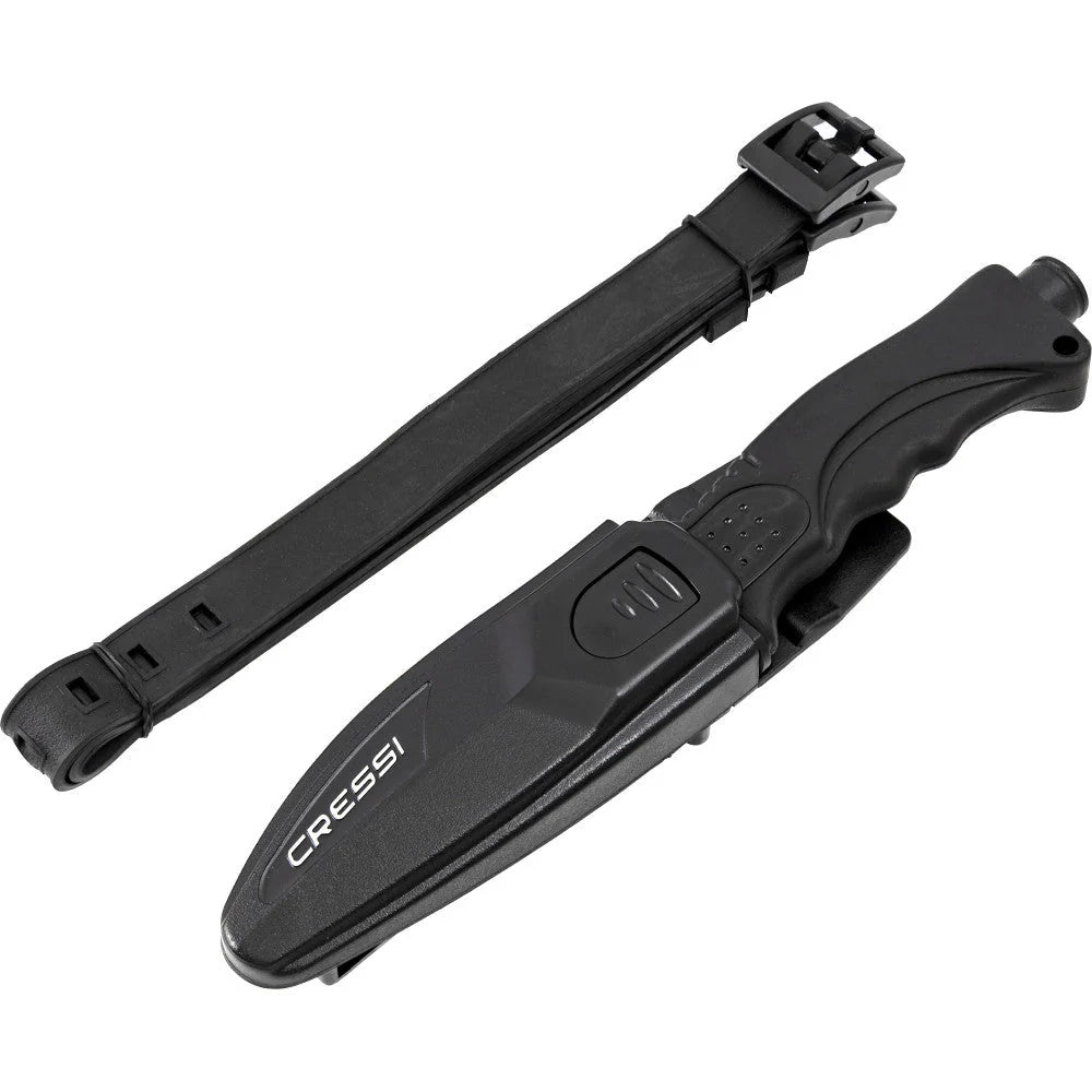 Cressi's Skorpion Knife is a medium modern knife with futuristic design. The strong black coated Japanese 420-stainless-steel blade is tough and durable assuring years of reliable use. The Skorpion Knife is available with a drop point or blunt tip design. The Skorpion has a complete straight edge blade on one side and a partial serrated edge on the other. Blade also comes equipped with a line cutter. The durable ergonomically designed techno-polymer handle with finger grips and thumb tab fits comfortable in the hand.