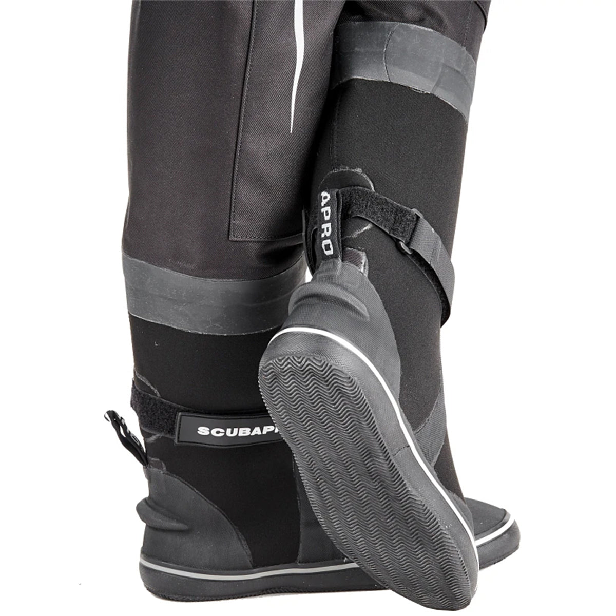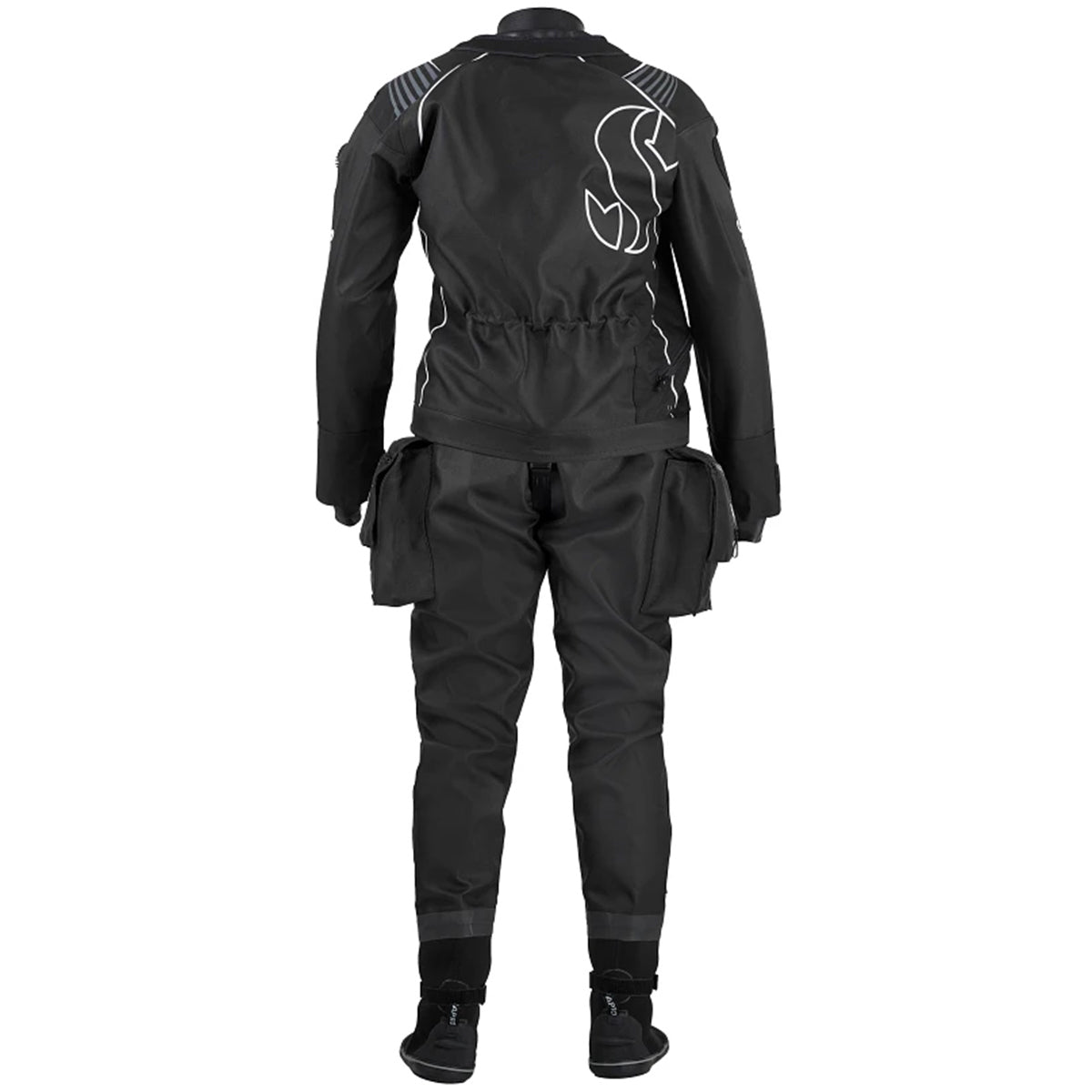 Understanding the challenges divers face, the drysuit comes with semi-rigid dive boots with anti-slip soft soles, allowing comfortable movement on rough terrains. To further enhance the fit, the boots have hook & loop straps, ensuring that the air doesn't travel to the feet and disrupt the balance. For convenience, two spacious cargo pockets have been incorporated, complete with D-rings, blue bungee, and high-security over-flaps.